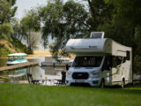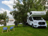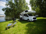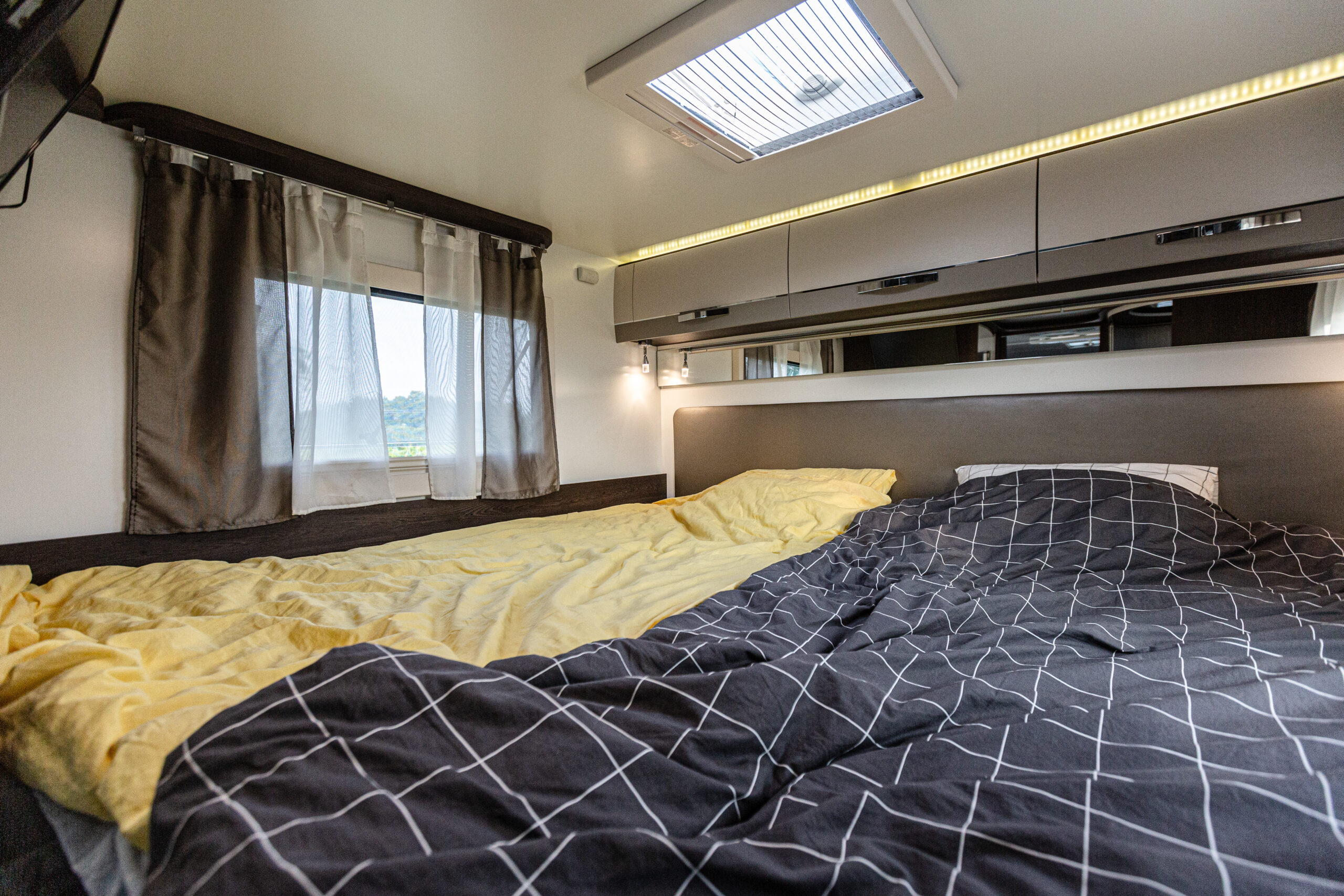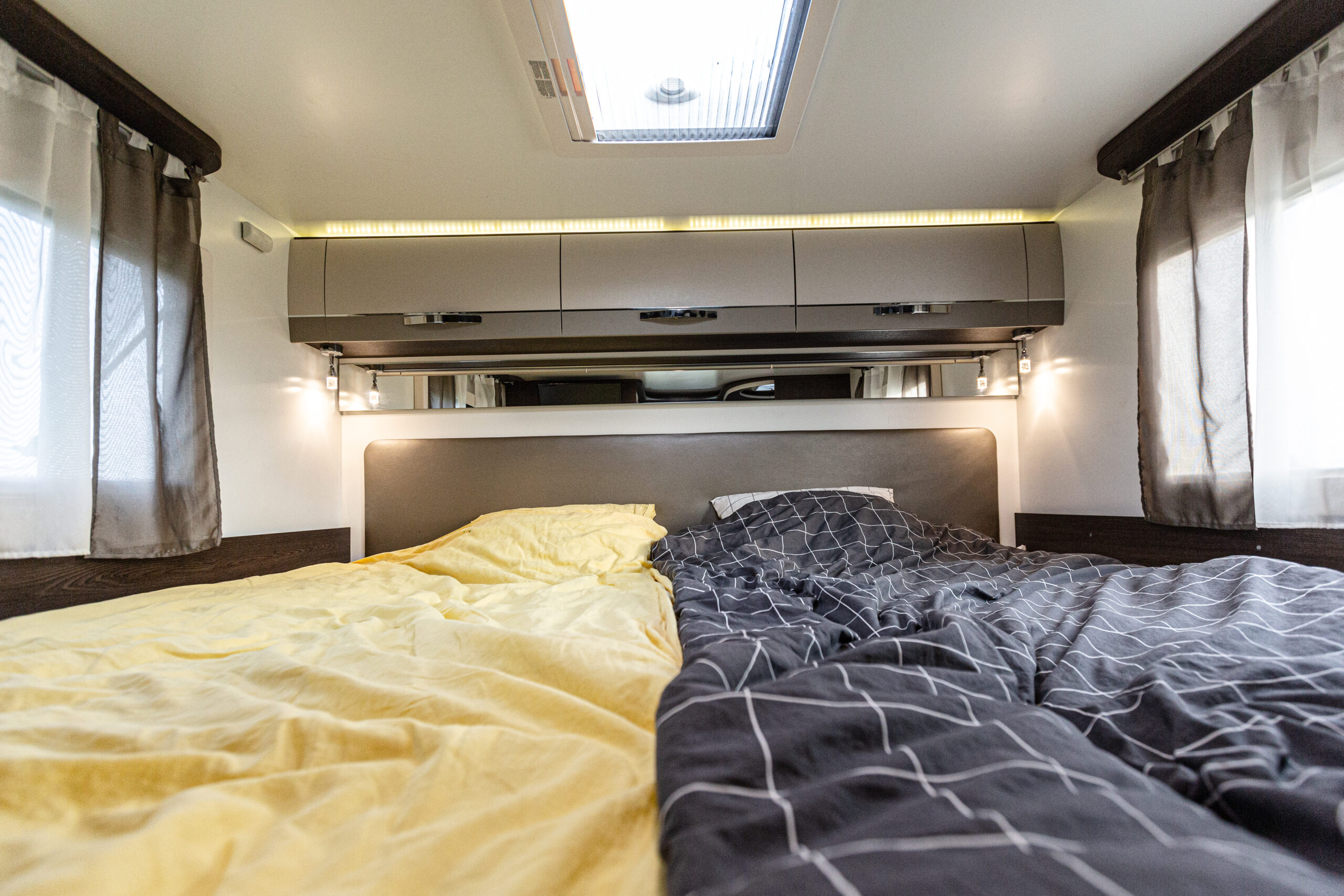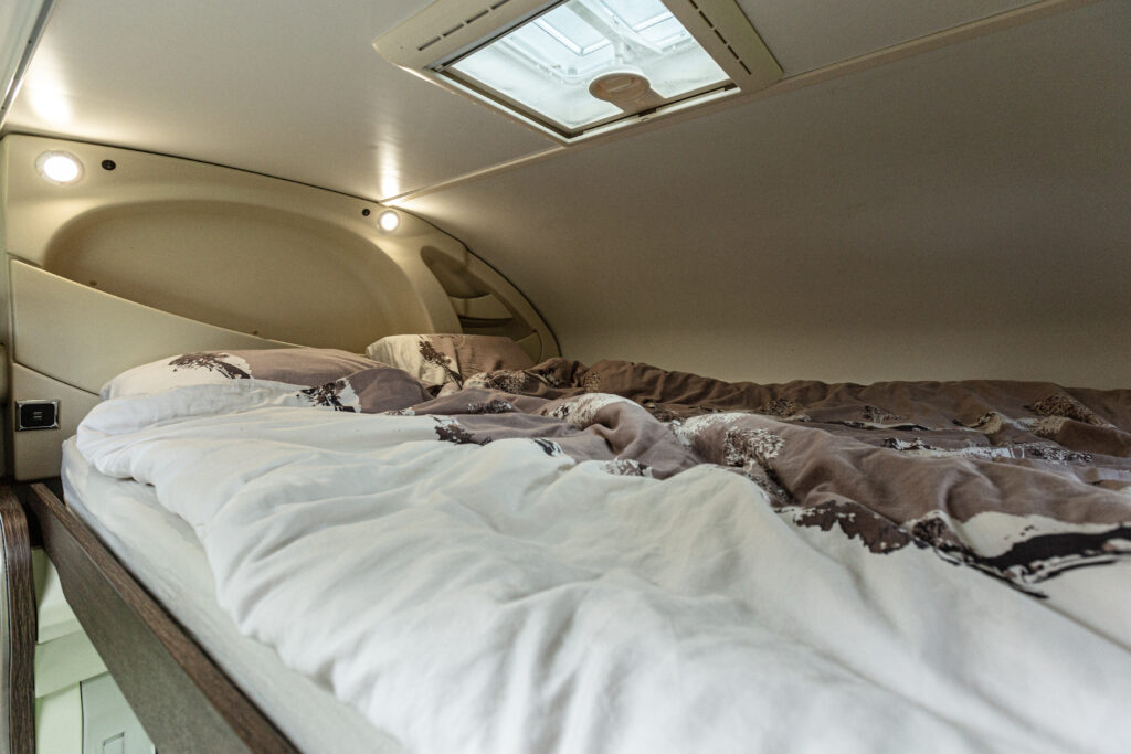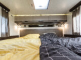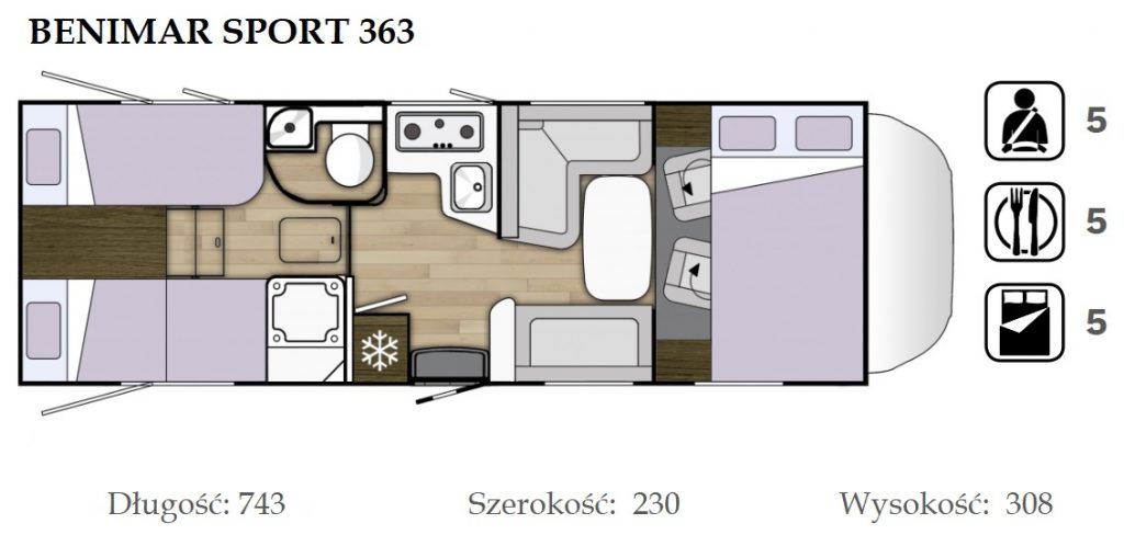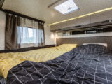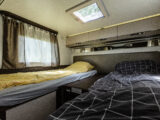 - dwie oddzielne sypialnie 3 i 2 osobowa, z tyłu 3 osobowe łóżko (205×190) z możliwością rozdzielenia na 2 pojedyncze( 2 szt – 190×79), łóżko w alkowie 2 osobowe (203×155) nad kabiną kierowcy, dodatkowo łóżko w salonie (210×90),