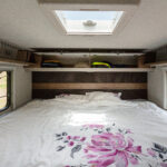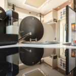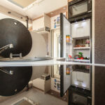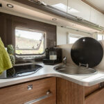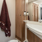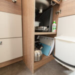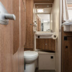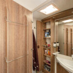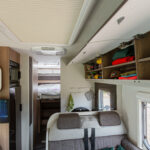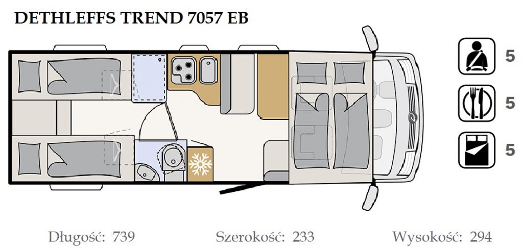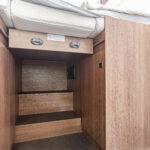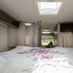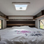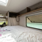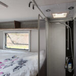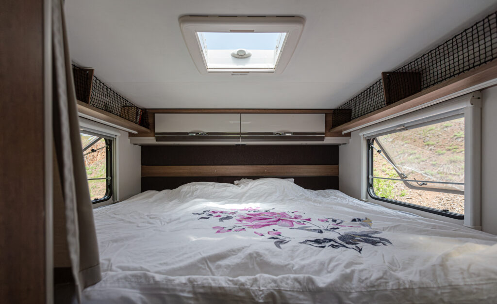 - dwie oddzielne sypialnie 2 i 3 osobowa, z tyłu 3 osobowe łóżko z możliwością rozdzielenia na 2 pojedyncze (210×80 i 205×80 lub połączone 215×210/205, łóżko opuszczane 2 osobowe (195×150 max 250kg) nad kabiną kierowcy,