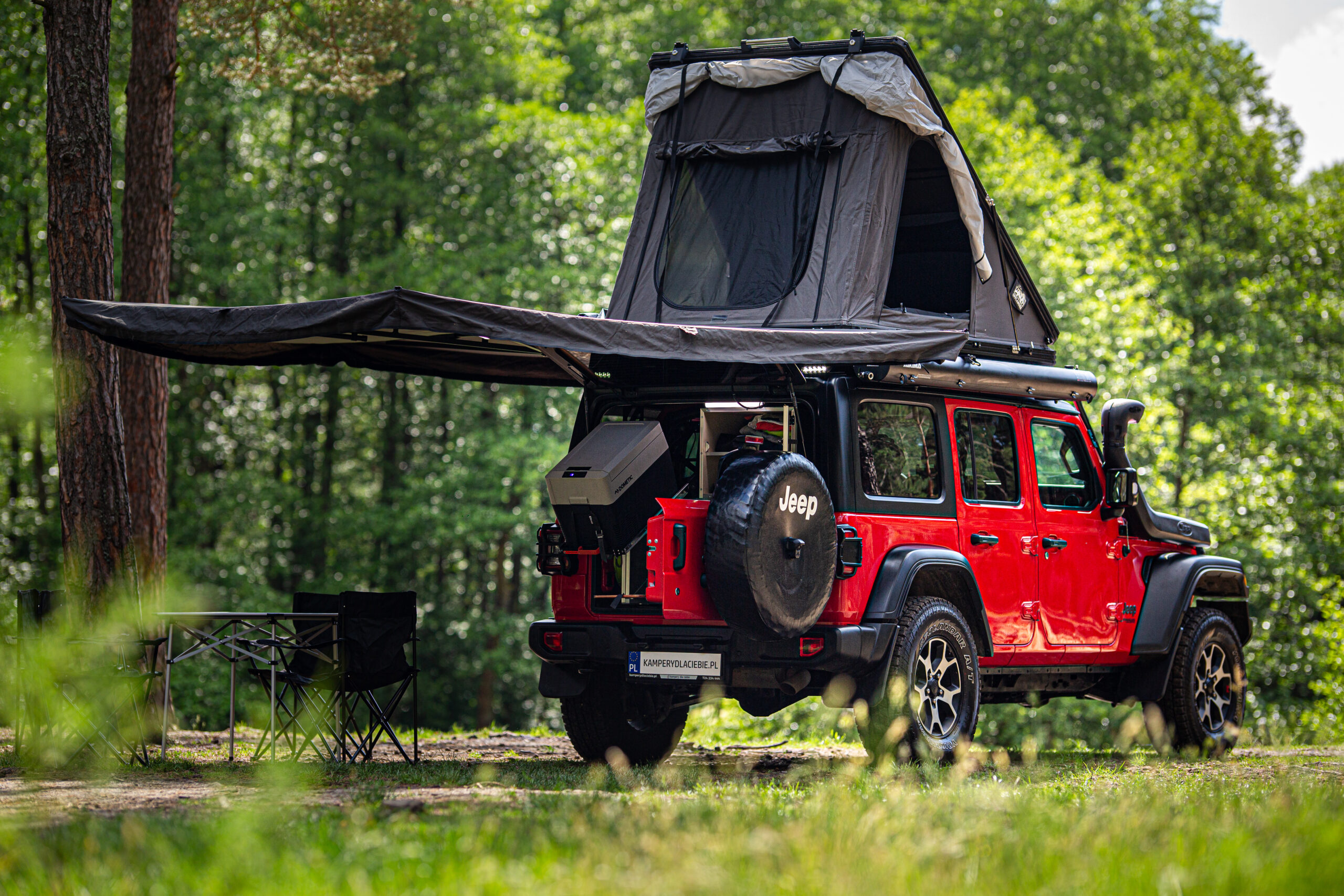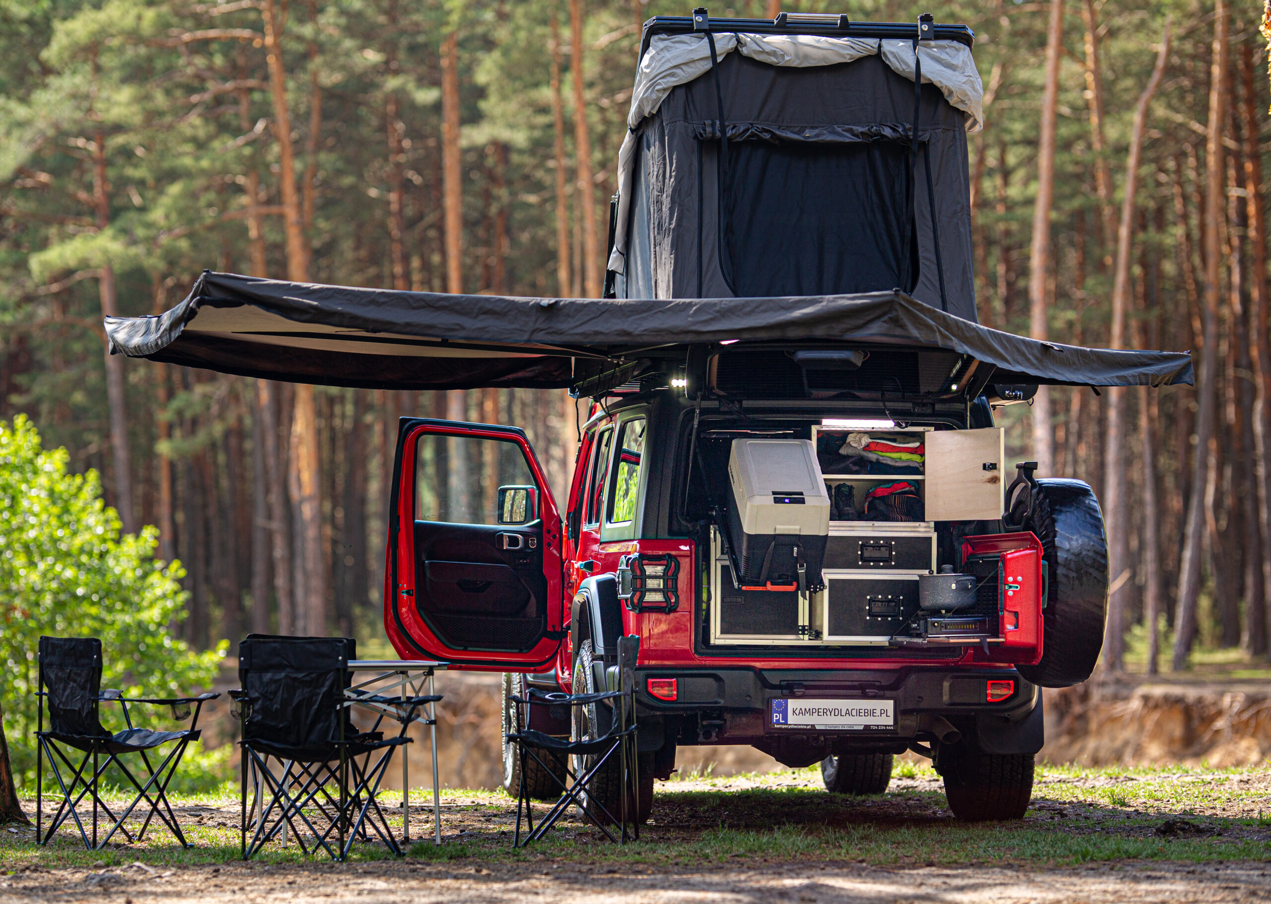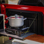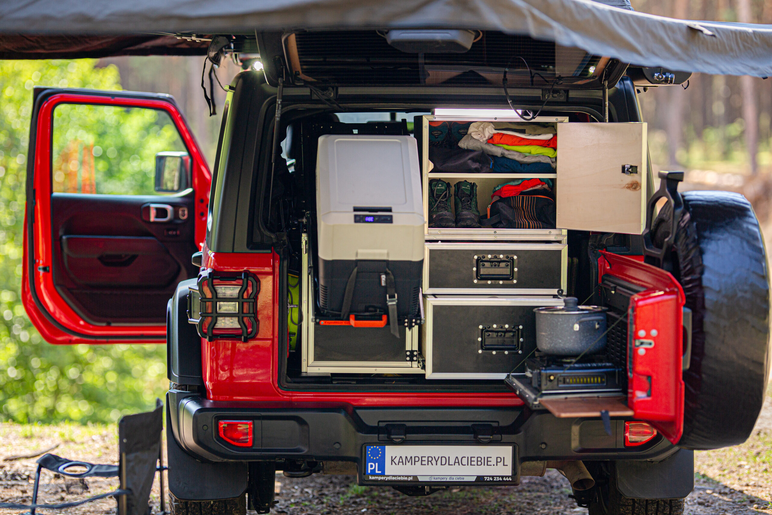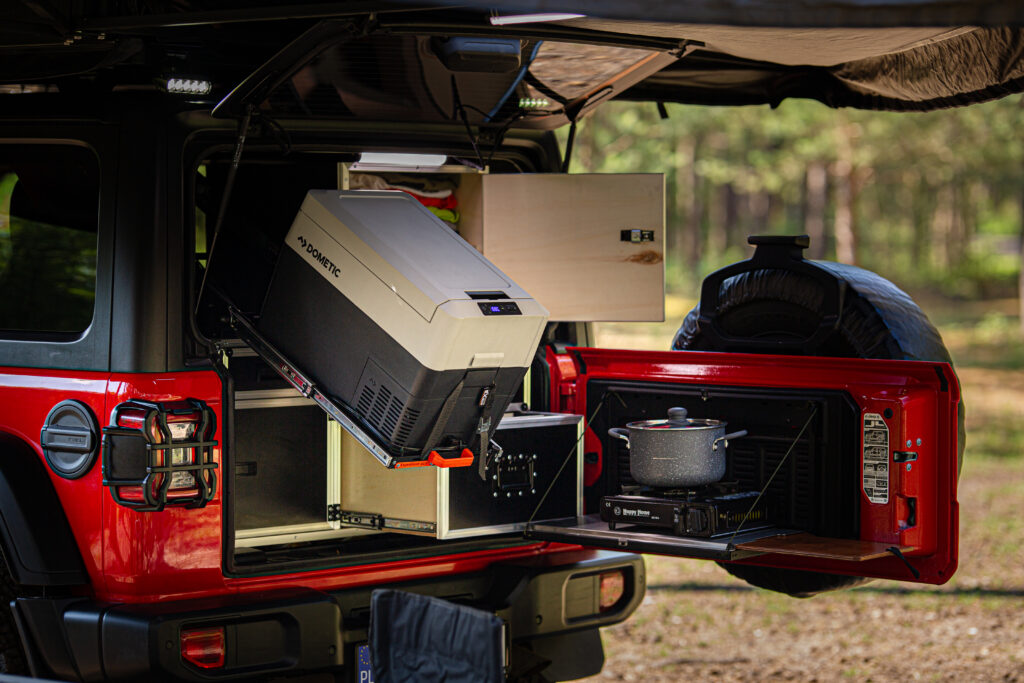 - zabudowa bagażnika: szafki i szuflady: kuchenka gazowa, lodówka Dometic CDF36, zastawa kuchenna: garnki, patelnia, talerze, kubki, sztućce i inne, ekspres do kawy,