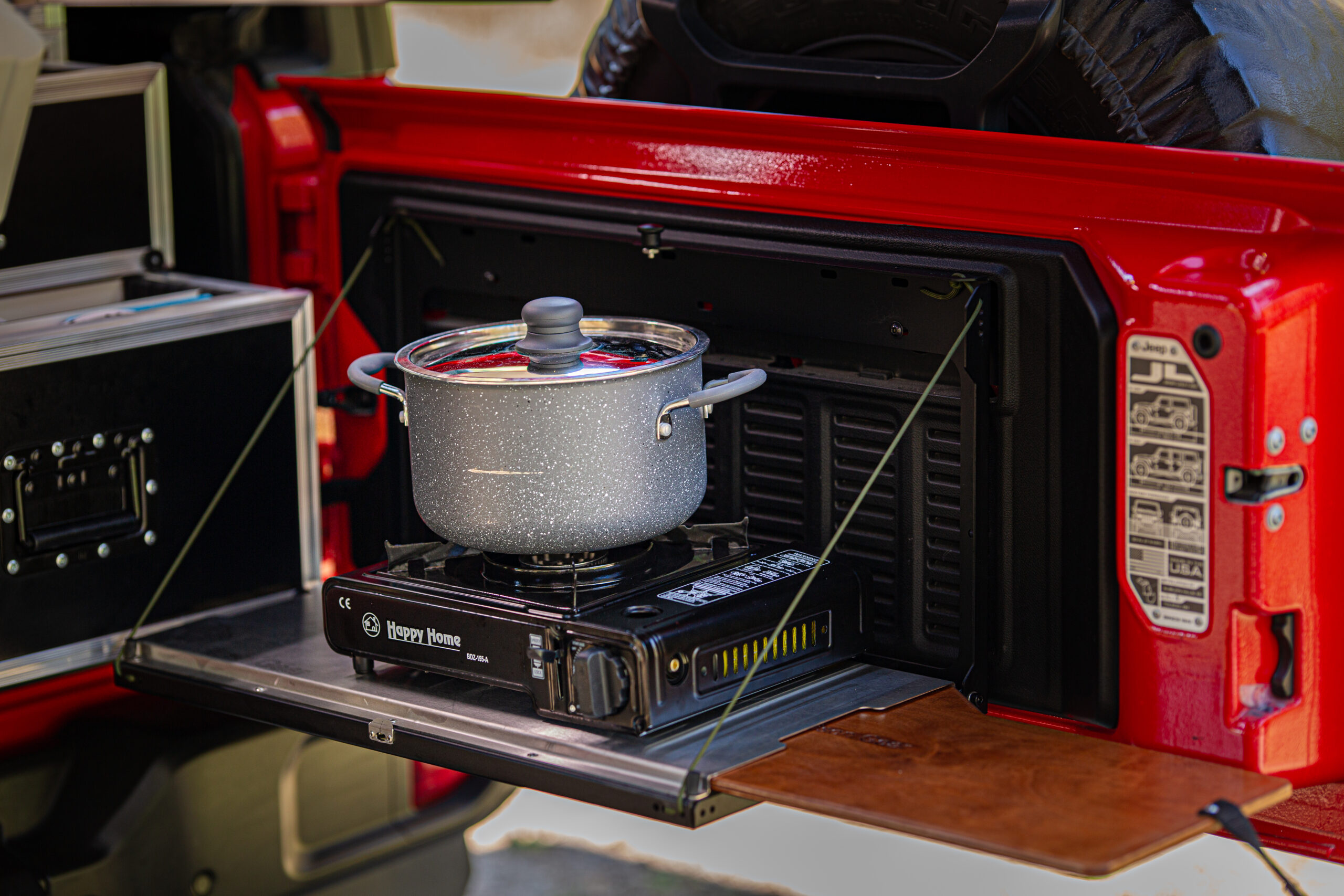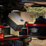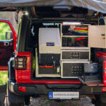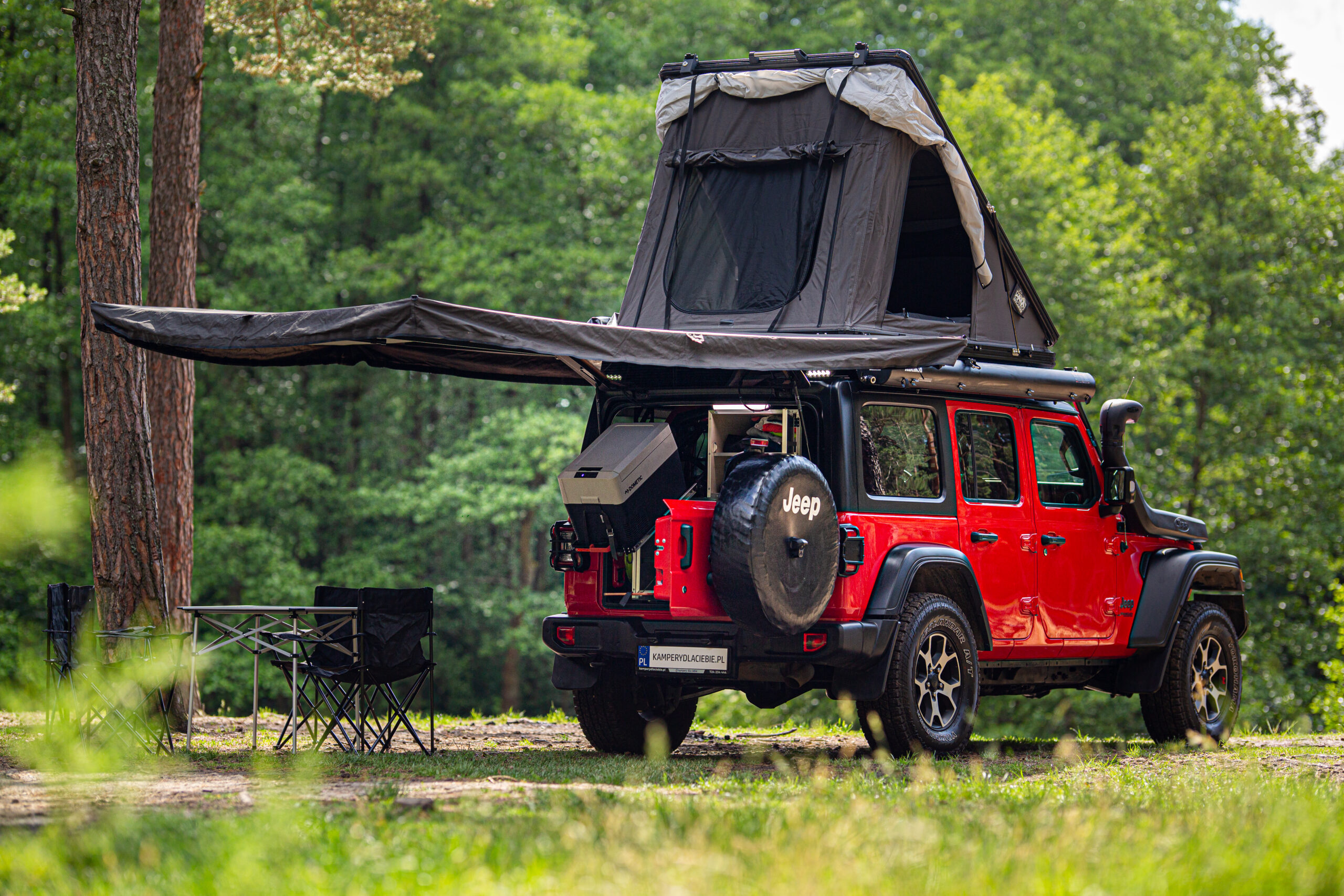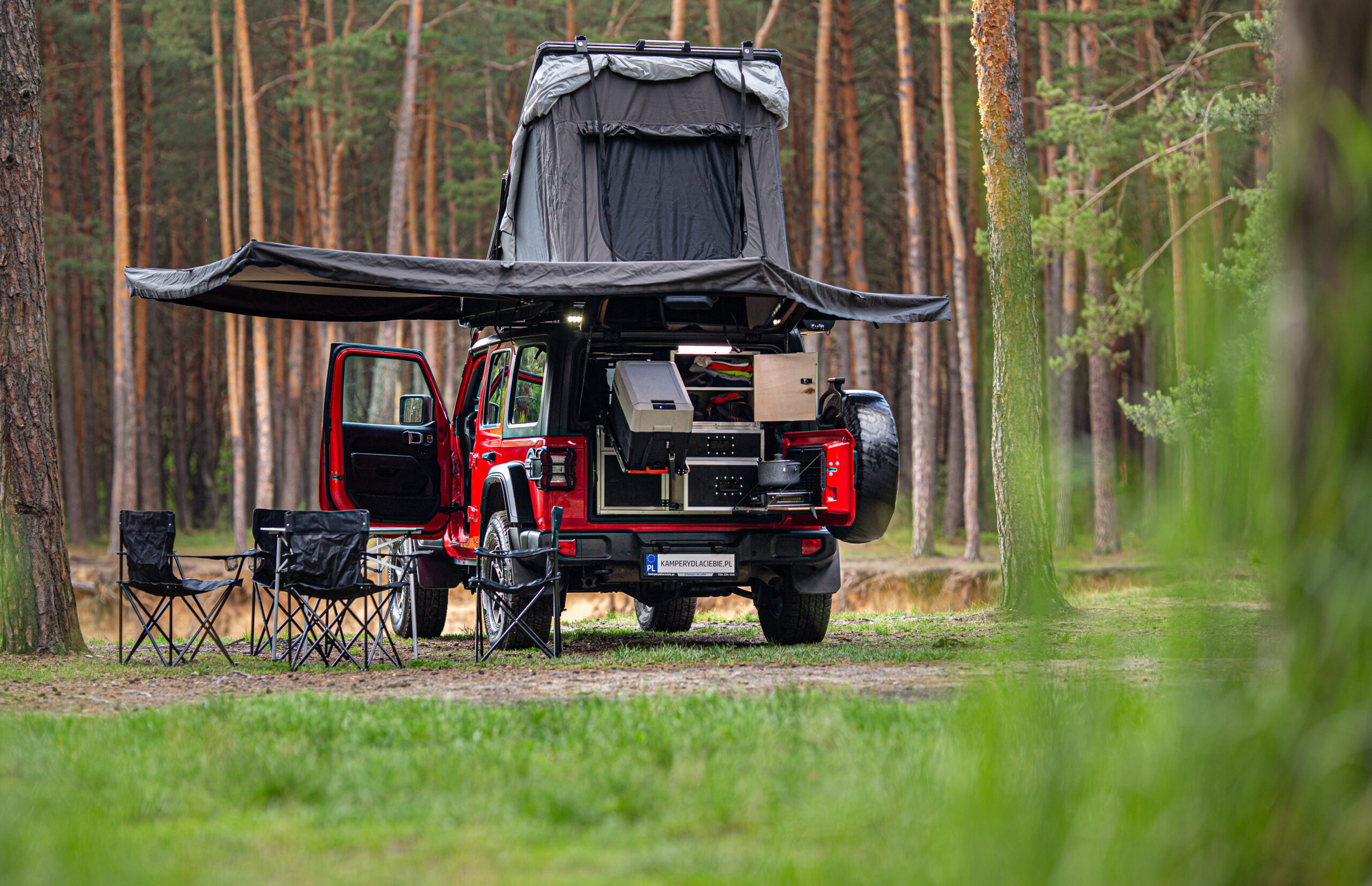 - zabudowa bagażnika: szafki i szuflady: kuchenka gazowa, lodówka Dometic CDF36, zastawa kuchenna: garnki, patelnia, talerze, kubki, sztućce i inne, ekspres do kawy,